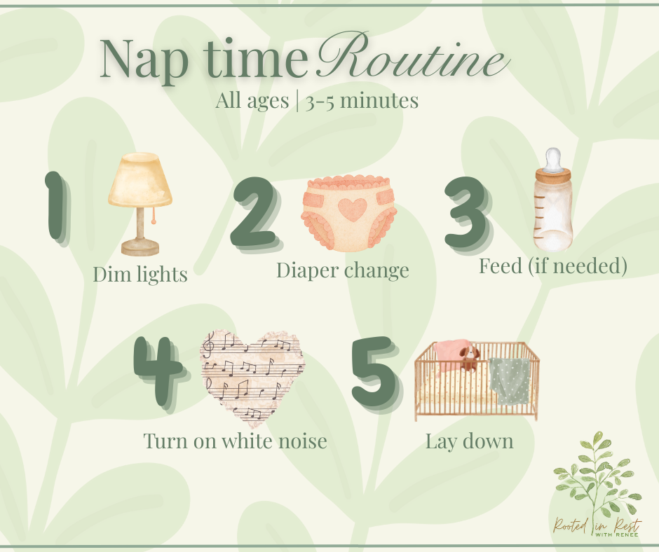 Nap routines are often just 3 to 5 minutes. A diaper change, a song, and into the crib can be enough. The goal is consistency, not length.